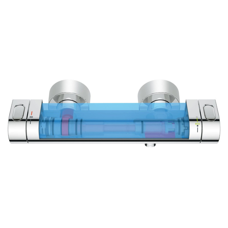 Dvi valdymo rankenėlės - viena reguliuoja temperatūrą, kita vandens srovę. Vandens srovės rankenėlė turi Grohe Eco-mygtuką, kurį paspaudus, bus efektyviai panadojamas vanduo. Įvykus staigiems vandens temperatūros šuoliams, saugus maišytuvo užraktas turi 38 laipsnių temperatūra neleis jai šoktelti aukščiau. Taip bus apsaugota Jūsų oda nuo nusiplikymų karštu vandeniu. Maišytuve yra integruoti nešvarumų filtrai. Tai užtikrina maišytuvo ilgaamžiškumą.