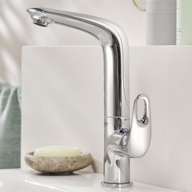 • su GROHE SilkMove® technologija, kuri užtikrina, kad gaminiui nereikėtų jokios priežiūros, jis būtų patogus ir ilgai tarnautų. Su rankena galima itin tiksliai ir nesudėtingai reguliuoti tolygaus judėjimo vandens temperatūrą ir srovės stiprumą. GROHE maišytuvų sukimo spindulys labai platus, tad temperatūros reguliavimas ypač patogus vartotojui;