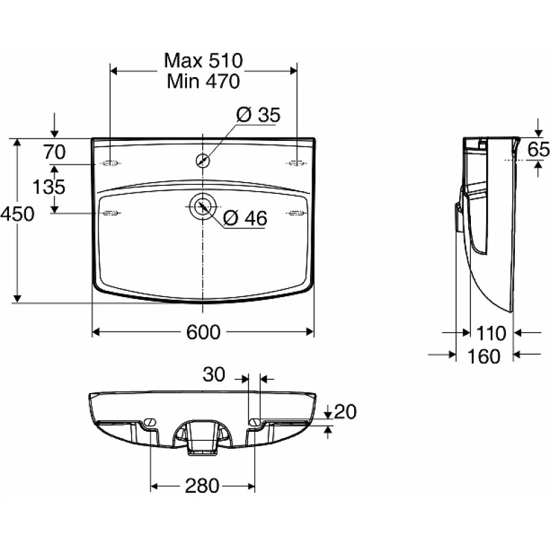 Praustuvas, 60 cm. Siūloma ir lengvesniam valymui skirta versija be persipylimo angos ir (ar) maišytuvo skylės.