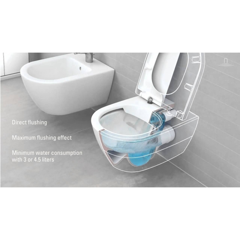 Pakabinamas klozetas Villeroy & Bosh Avento su Direct Flush funkcija ir su lėtaeigiu dangčiu.