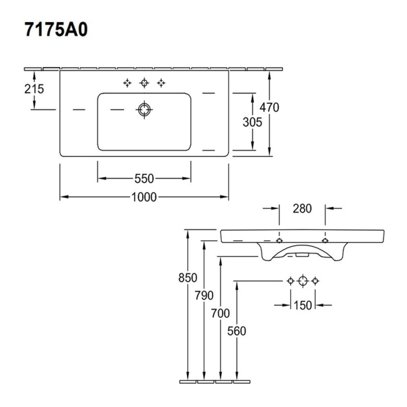 Praustuvas turi vieną angą maišytuvui (yra paruoštos vietos ir trijų dalių maišytuvui);