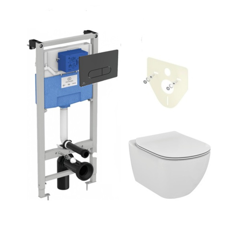 Ideal Standard potinkinis rėmas su sieniniais laikikliais ir juodu matiniu dvigubu klavišu. Tesi pakabinamas WC puodas su AquaBlade® nuplovimo sistema ir lėtai nusileidžiančiu dangčiu. Unikalus vandens taupymo sprendimas.