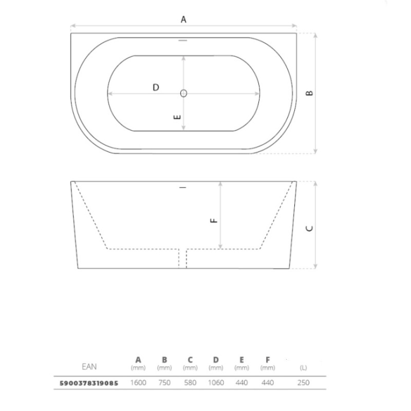 Vonios matmenys 1600x750x580