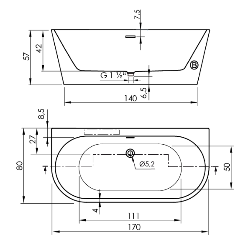 Akrilinė vonia glaudžiama prie sienos Sanycces Trento Muro 170x80 cm komplekte yra dugno vožtuvas,