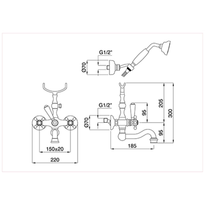 Bugnatese Arcadia maišytuvas voniai su dušo galvute ir atskiru laikikliu spalvų pasirinkimas chromas, bronza, auksas
