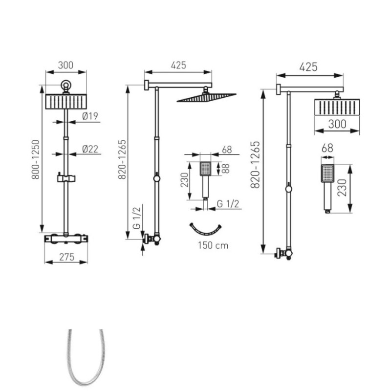 - reguliuojamo ilgio 800 - 1250 mm dušo stovas