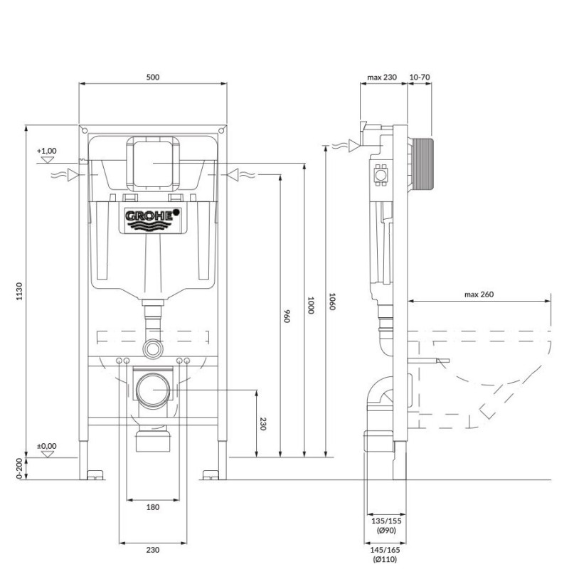 - GROHE RAPID SL 2in1 įleidžiamas plieninis rėmas WC puodui (aukštis: 113 cm, plotis: 50 cm, montavimo gylis: 13 - 23 cm);