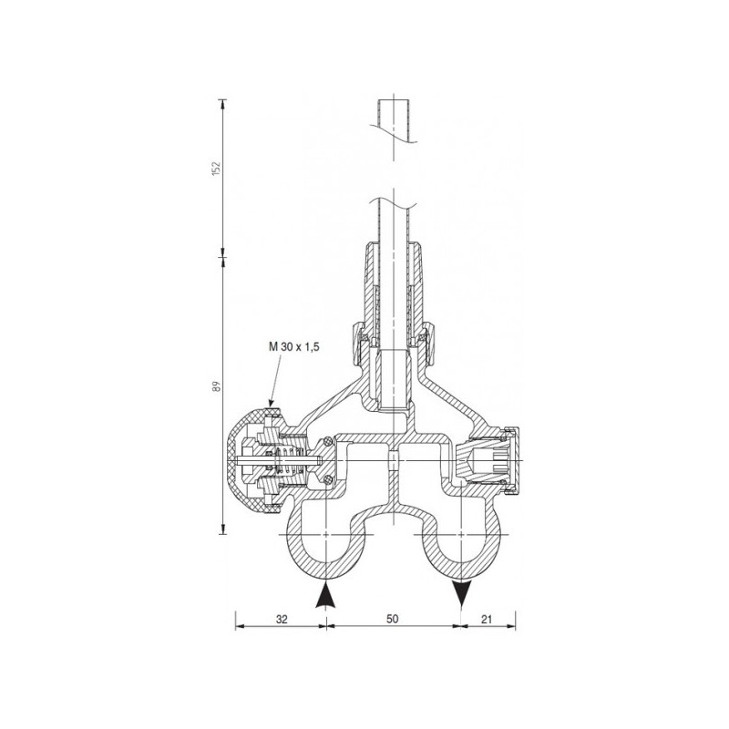 Termostatinio apatinio centrinio radiatorių pajungimo mazgas. Atstumas tarp centrų 50 mm.