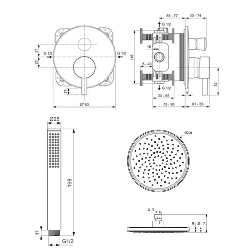 Potinkinė dalis, 200 mm galva, rankinis dušas "stick", 1/2 alkūnė su likikliu, 400 mm sieninė alkūnė, juoda matinė