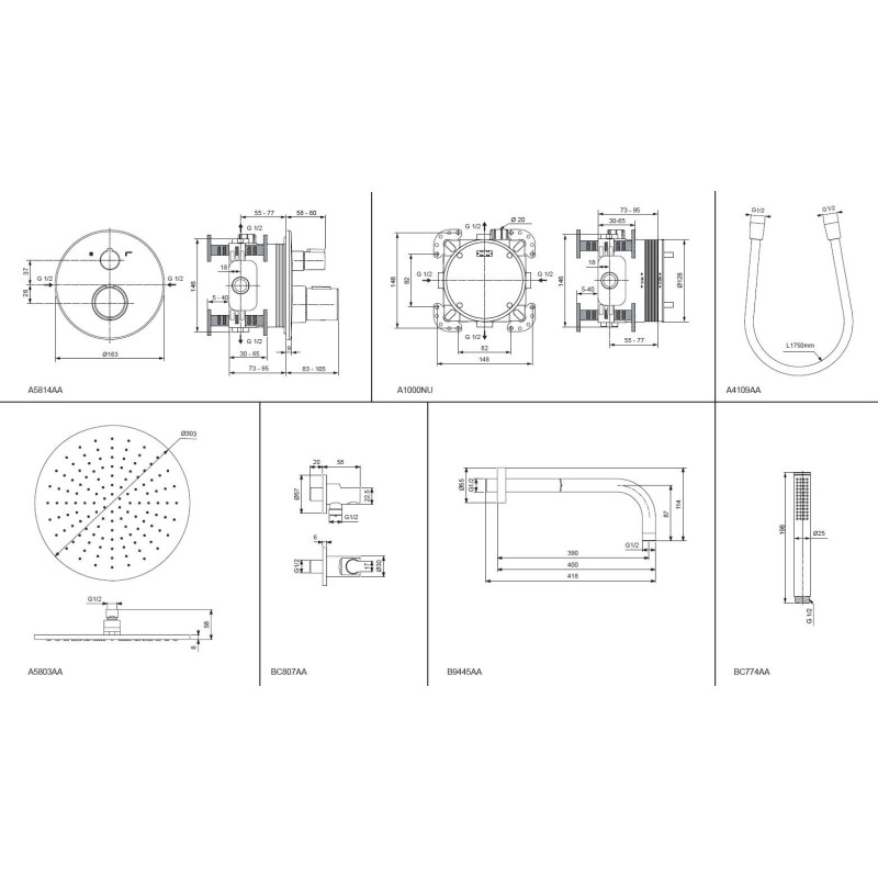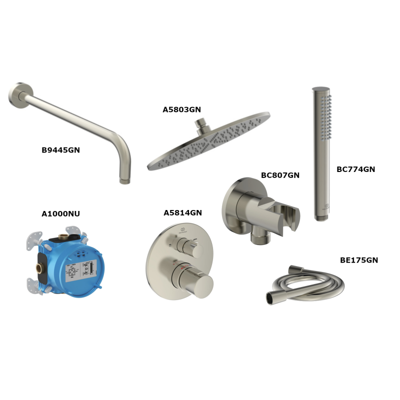 Ideal Standard Ceratherm 100 potinkinė termostatinė dušo sistema: apvali 300 mm metalinė galva, rankinis dušas, 1/2 alkūnė su likikliu, 400 mm sieninė alkūnė