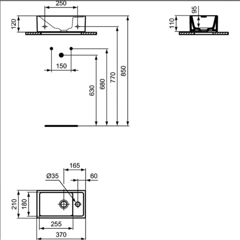 Ideal Standard TEMPO rankų praustuvas 37 cm, maišytuvo skylė kairėje, be persipylimo  Ideal Standard TEMPO rankų praustuvas 37 cm, maišytuvo skylė kairėje, be persipylimo