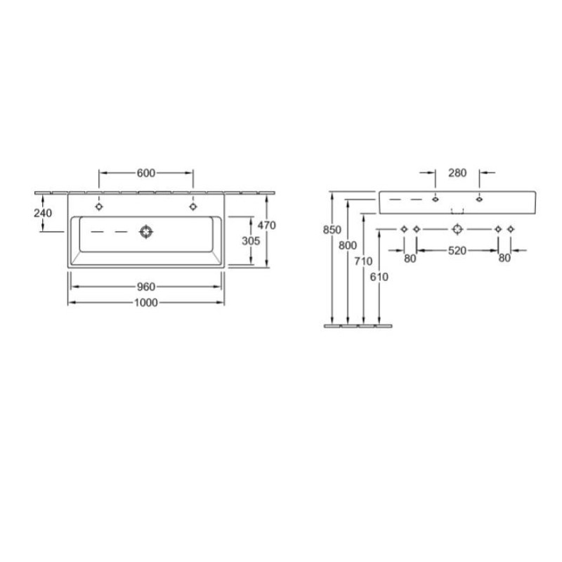 Pakabinamas praustuvas su dviem skylėmis maišytuvams Villeroy&Boch Memento 1000x470