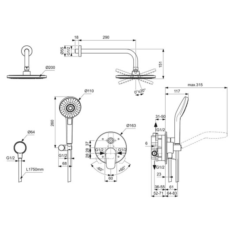 Komplekte yra: viršutinis dušas, dušo komplektas, dušo maišytuvas, sieninis laikiklis, žarnos jungtis
