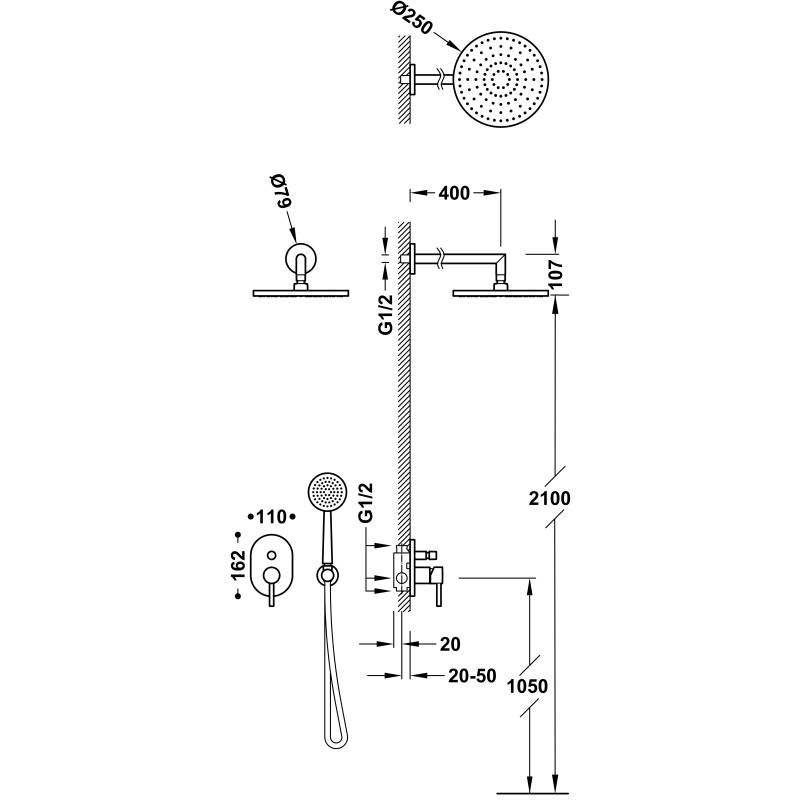 Dušo galva: 225 mm.