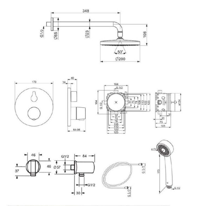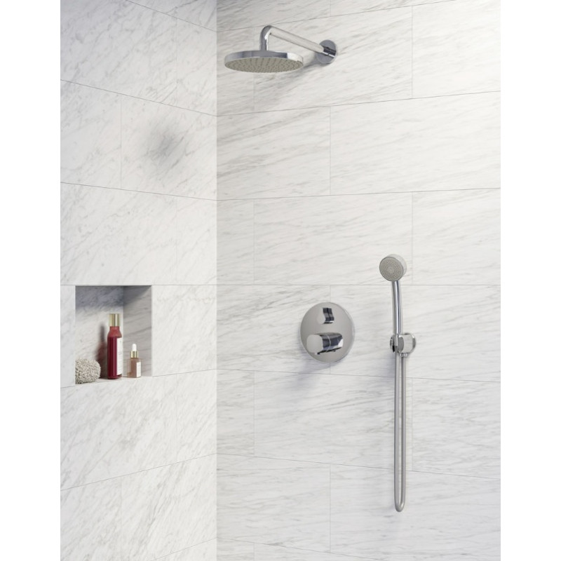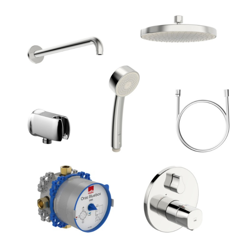 ienoje montuojamas termostatinis dušo sistemos rinkinys, komplektuojamas su universaliu Oras Bluebox potinkiniu korpusu, kuris tinka įvairioms vonios kambario sistemoms sukurti bei pasižymi išskirtinėmis funkcijomis ir montavimo savybėmis ir ø170 mm dekoratyviniu dangteliu. Rinkinį taip pat sudaro kruopščiai parinkti aksesuarai: plati ø200 mm lietaus dušo galva, bei 350 mm ilgio lietaus dušo alkūnė, ø70 mm antikalkinis rankinis dušas, 1,5 m ilgio matinė dušo žarna, sieninė dušo jungtis su intergruotu rankinio dušo laikikliu. Dušo sistemai papildomo saugumo suteikia temperatūros reguliavimo rankenėlėje įdiegtas temperatūros ribotuvas, kuris apeinamas paspaudus mygtuką (nustatytas 38°).