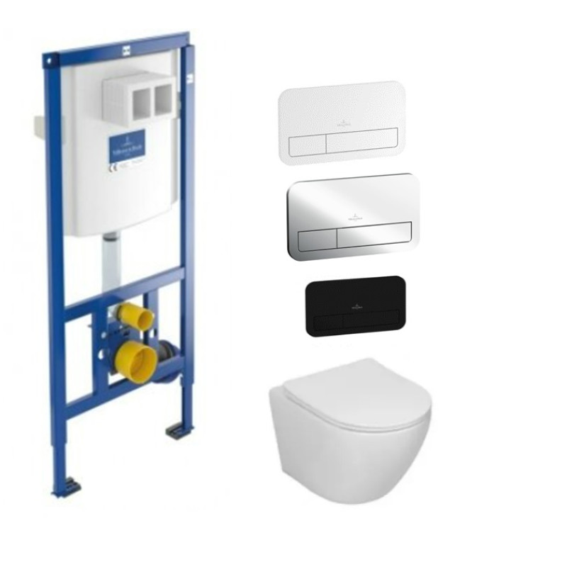 Villeroy & Boch ViConnect potinkinis rėmas su mygtuku ir SINTO Rimless pakabinamu klozetu su Slim lėtai nusileidžiančiu dangčiu;