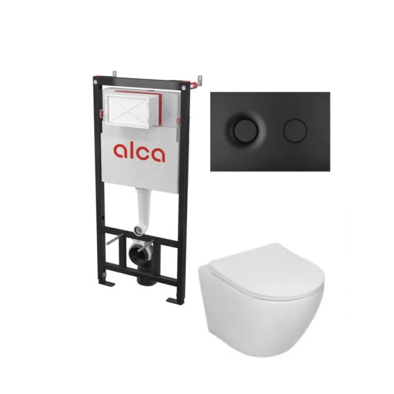Potinkinis WC rėmas Alcadrain 5in1 su Alca fresh ir Sinto klozetas su sukūrinė vandens nuleidimo sistema ir lėtaegiu dangčiu ir juodu matiniu mygtuku