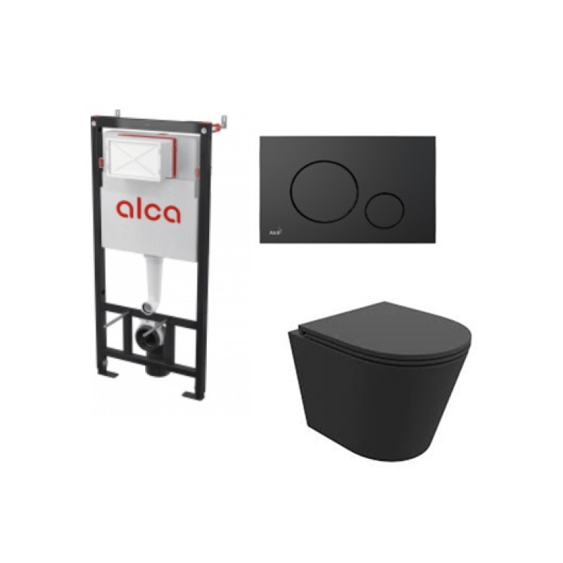 Potinkinis WC rėmas Alcadrain 5in1 su  Fresh rėmeliu tabletėms  ir Galve juodas klozetas su lėtaeigiu dangčiu