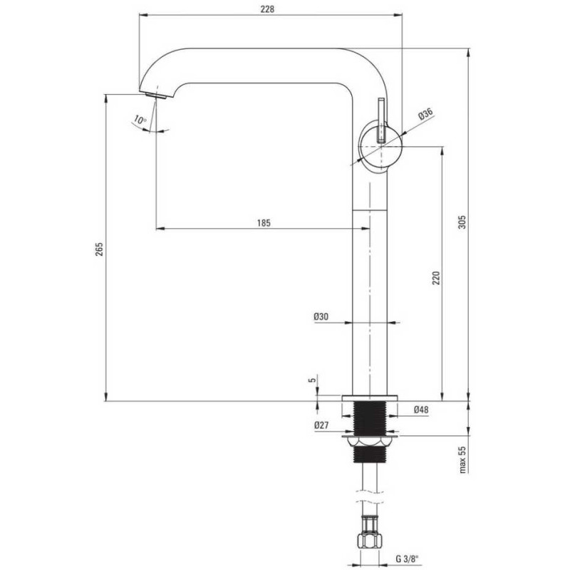 - Tipas: aukštas praustuvo maišytuvas su stačiakampiu snapu;