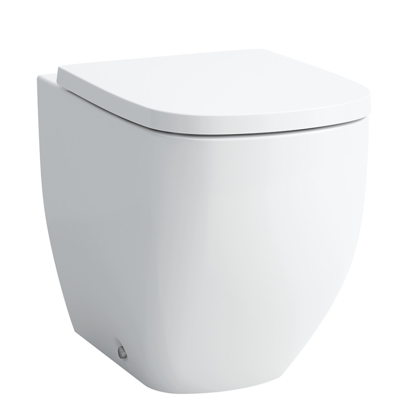 Ovalių formų, pilnai priglundantis prie sienos pastatomas klozetas be bakelio Laufen Palomba su lėtai nusileidžiančiu dangčiu.