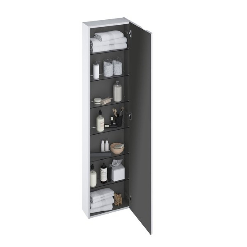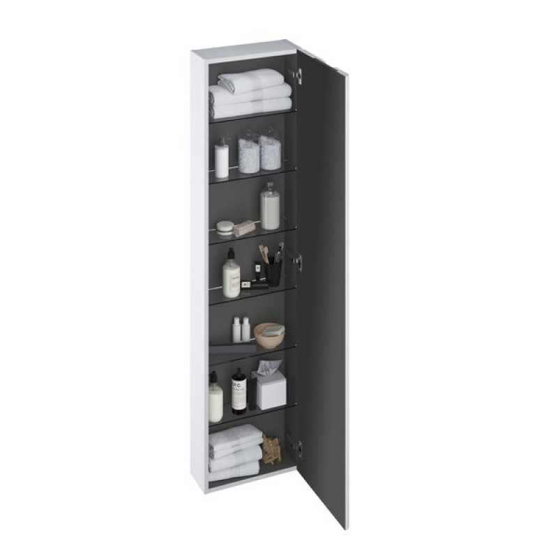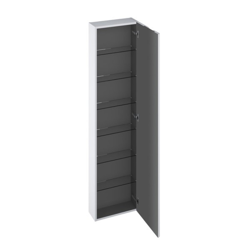 Aukštą spintelę SB Balance 400 su šešiomis neskaidraus stiklo lentynėlėmis galite pasirinkti baltos/baltos arba baltos/grafito spalvos. Spintelės vidus visada yra grafito spalvos.