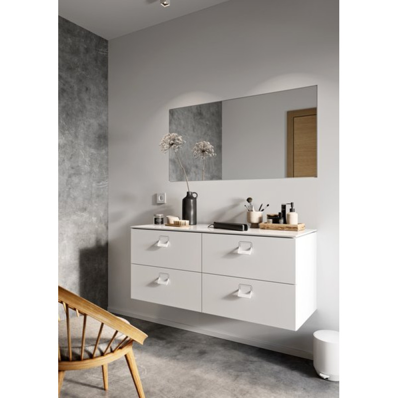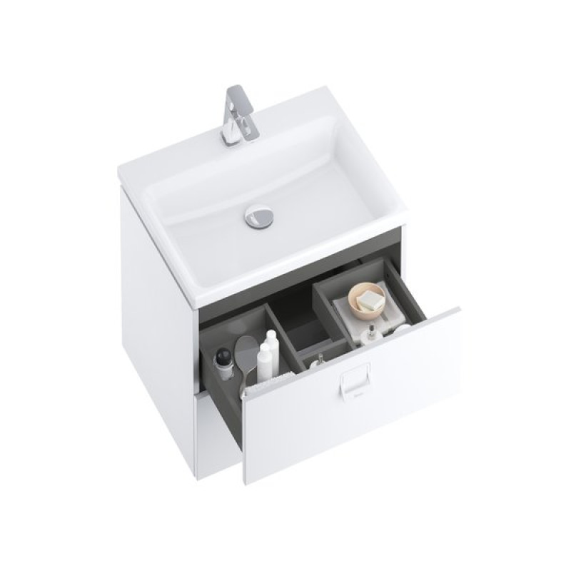 Erdvi spintelė su dviem stalčiais (slanki sistema). Dvi pusiau įleidžiamos metalinės rankenos palengvina stalčių judėjimą ir standartiškai tiekiama baltos spalvos. Įrengimui taip pat galime pasiūlyti ir chromuotas rankenas. Pakabinamą spintelę galima derinti su įleidžiamu keraminiu praustuvu Comfort 600 ir praustuvo kasete su stacionariu išleidimu. Kitas sprendinys – kombinacija su plokšte Comfort 600 ir praustuvu, montuojamu ant plokštės.  Dar daugiau erdvės daiktams sudėti sukursite panaudoję plokštę Comfort 1200, papildytą plokštės konsole ir rankšluosčių laikikliu Comfort, ant kurios bet kurioje vietoje pritvirtinsite praustuvą, montuojamą ant plokštės. Po šia plokšte tilps ir dvi spintelės SD Comfort 600.