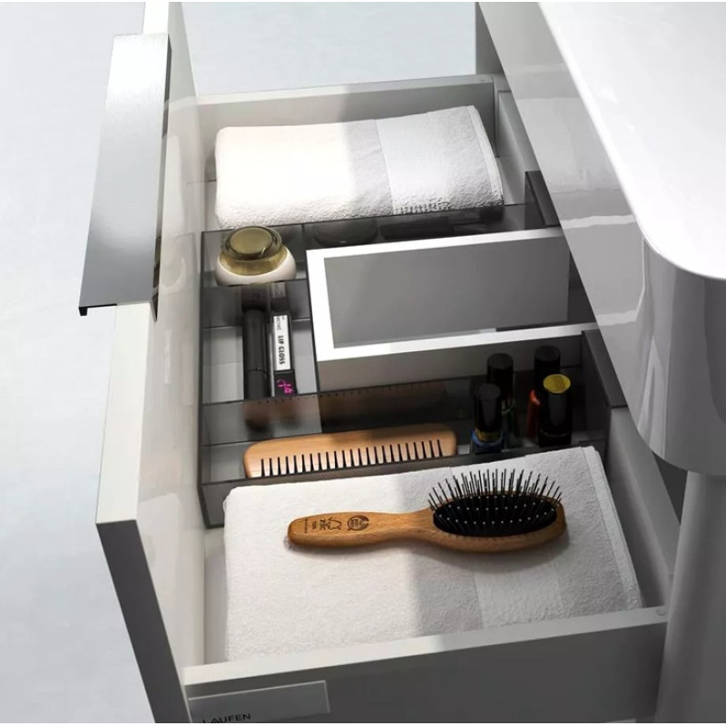 Laufen sukurta lėtojo uždarymo sistema užtikrina, kad baldų durelės ir stalčiai užsivertų švelniai. Sistemos atskirai įsigyti nereikia – ji įrengiama visuose Laufen balduose. Šiuo atveju kokybę galima pajusti, tačiau išgirsti – niekada.