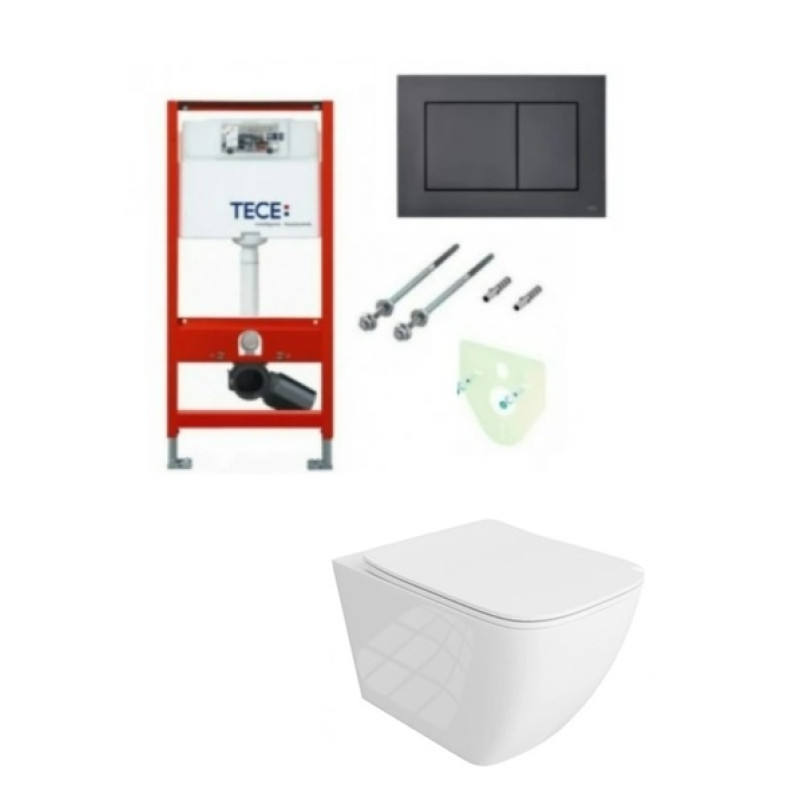 Tece rėmas su juodu TeceNow vandens nuleidimo mygtuku ir Onil rimless pakabinamu klozetu su lėtaeigiu dangčiu