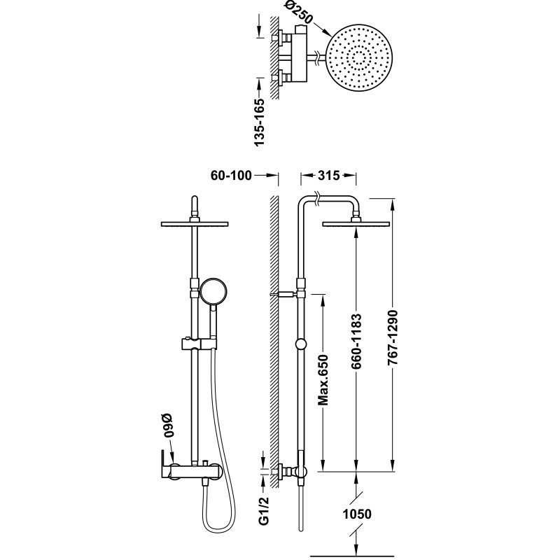 Dušo galvos dydis: 225x225 mm.